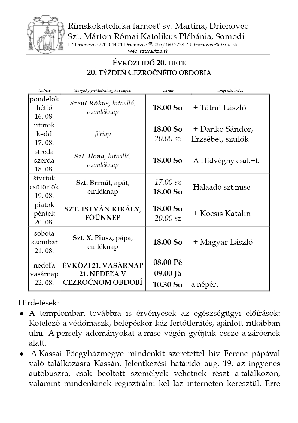 Hirdetések - Oznamy 2021 aug. 9. - 15.